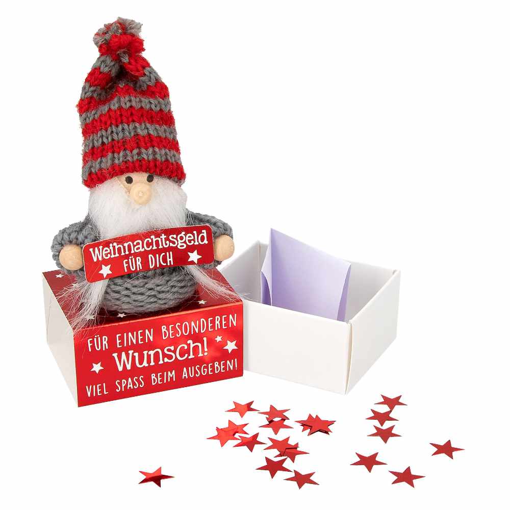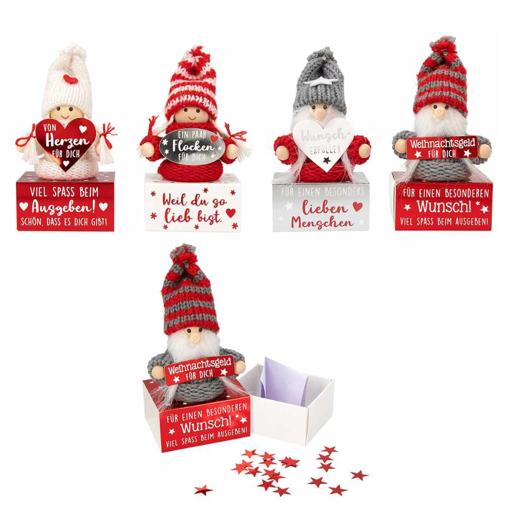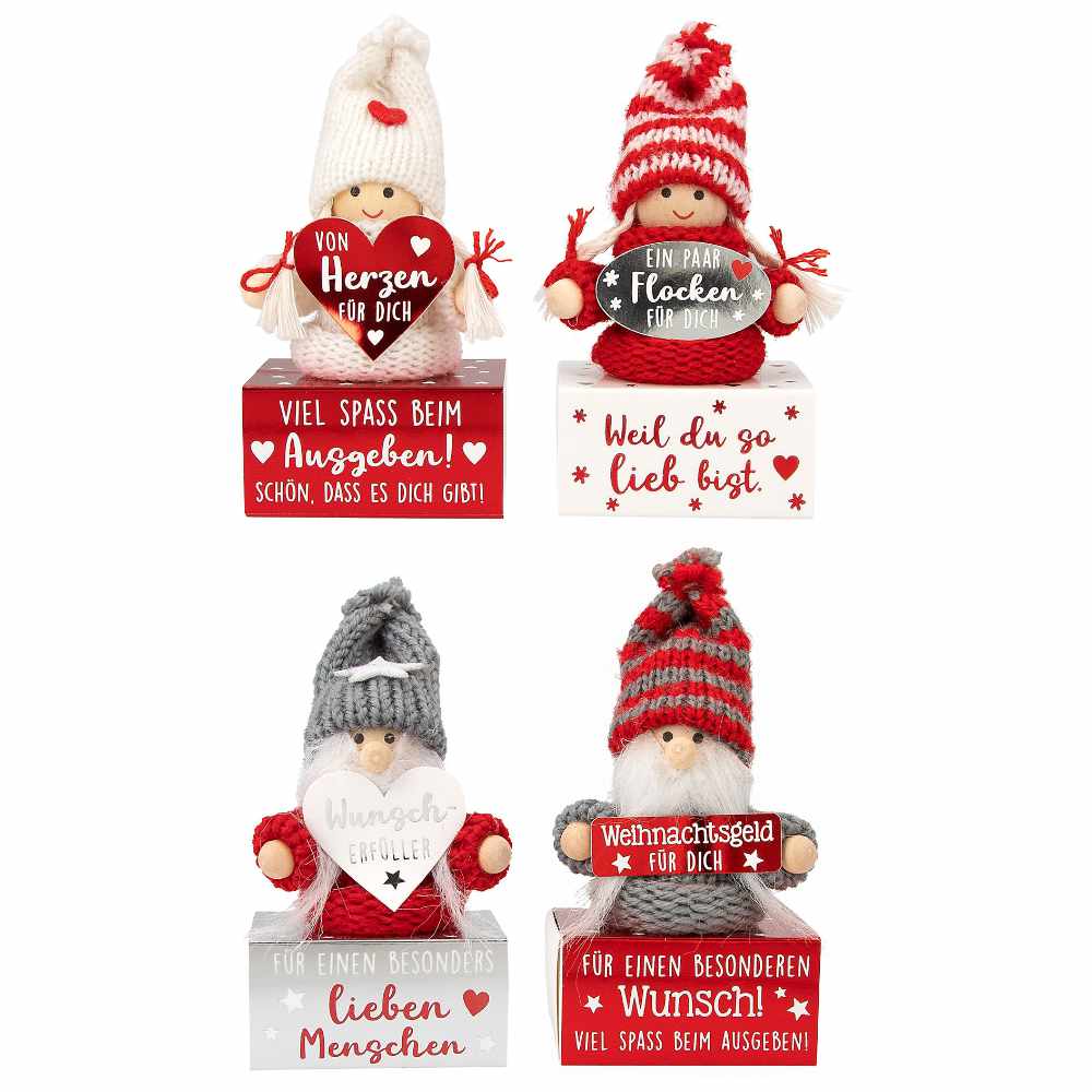 Weihnachtsengel und Wichtel wissen, wie es geht: Die süßen Geschenke-Profis mit Strickmütze sitzen auf einer kleinen Box mit Weihnachtsbotschaft, die wie geschaffen ist für ein kleines Präsent, einen Geldschein oder einen Gutschein. Frohes Schenken!