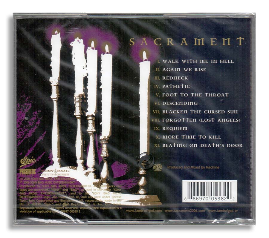 Sacrament ist das fünfte Studioalbum der US-amerikanischen Metal-/Groove-Metal-Band Lamb of God. Es wurde am 13. Oktober 2006 durch Epic Records veröffentlicht und erreichte Platz acht in den US-amerikanischen Albumcharts. Quelle: Wikipedia